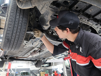 車検の作業が入庫してきました。ひとつづつ丁寧にチェックしましょう。もし、整備内容の他に、気になる点を発見したら、気兼ねなく先輩やマネージャーに報告しましょう。その気付きがお客様の満足度につながります