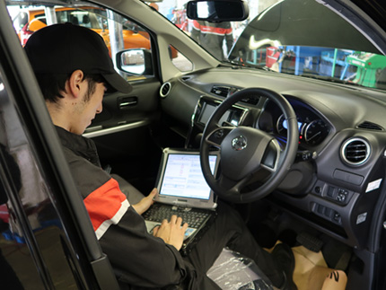 日産専用の診断機でお客様の車をチェックします。整備学校で学んだ基礎が職場で大いに役立ちます。しっかりと学校の授業で整備の基礎を身につけましょう。